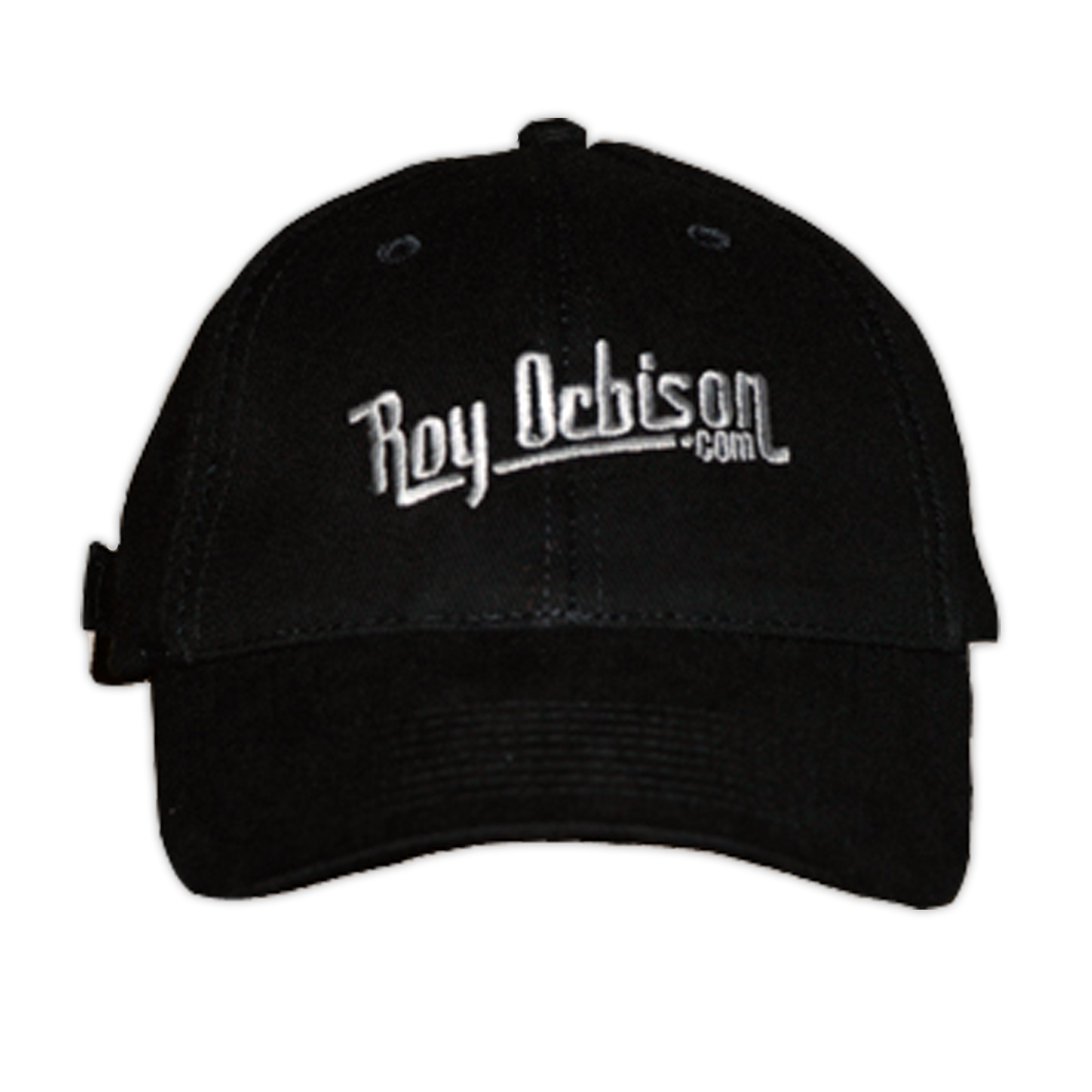 Black baseball cap with light gray embroidering of Roy Orbison.com logo