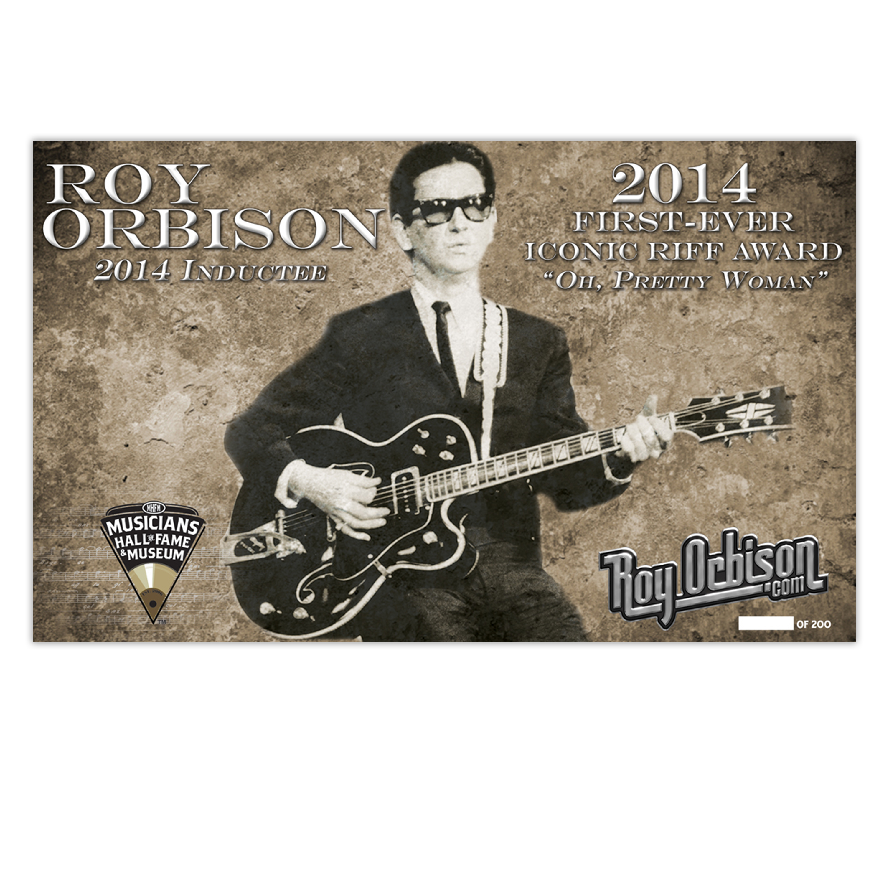 This Limited Edition Print honors Roy Orbison's Iconic Riff Award for the worldwide hit song "Oh, Pretty Woman" given by The Musicians Hall of Fame & Museum in Nashville, Tennessee on January 28th, 2014!